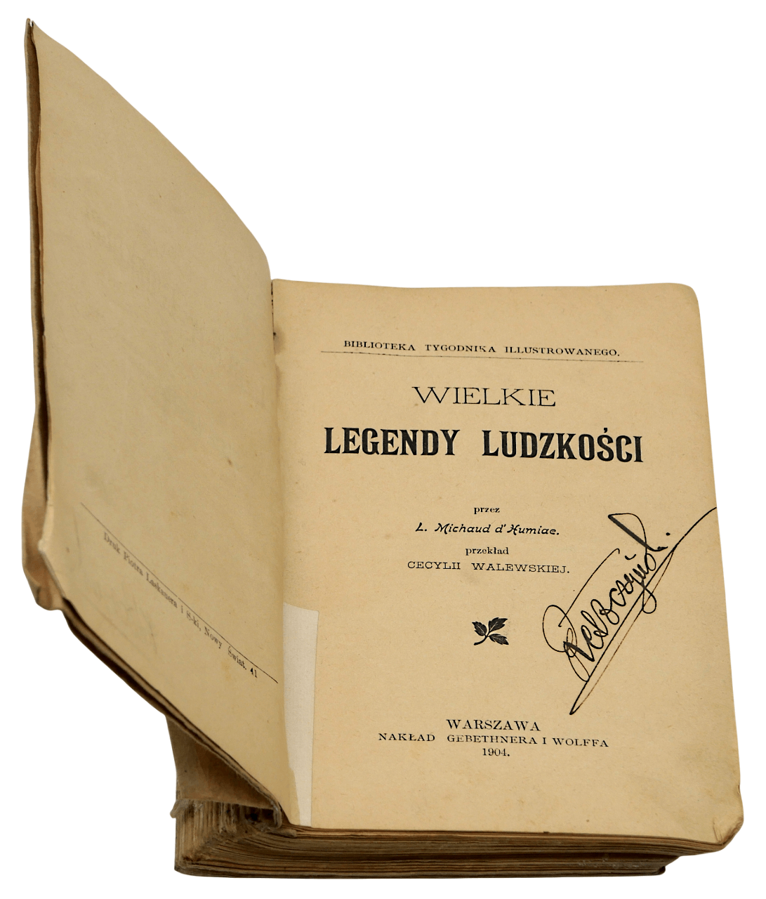Książka w stanie przeciętnym, brak okładki, kartki pożółkłe, podpis na stronie tytułowej.